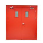 В двустворчатой конструкции используются два сплошных полотна шириной до 160 см. Эти двери предназначены для широких проемов. Они выдерживают открытое пламя и защищают помещение от вредных веществ, возникающих при горении.